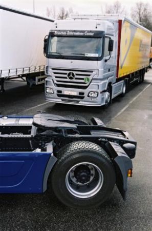 Der neue Mercedes-Benz Actros ist ab sofort mit den Bridgestone - Superbreitreifen Greatec Mega Drive in der Grösse 495/45 R 22,5 anstelle der herkömmlichen Zwillingsbereifung an der Hinterachse lieferbar. Neben Vorteilen bei Gewicht und Kraftstoffverbrauch bietet das von Bridgestone und DaimlerChrysler gemeinsam entwickelte Reifenkonzept mit „Aircept“ ein bislang einzigartiges Notlaufsystem. Selbst bei einem etwaigen Reifenplatzer erreicht es sowohl bei Geradeausfahrt als auch in der Kurve Sicherheitsreserven auf dem Niveau der heutigen Zwillingsbereifung sowie stabile Fahreigenschaften über rund 25 Kilometer bei 60 km/h zum Beispiel bis zur nächsten Werkstatt.